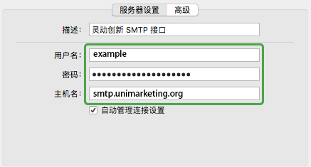 1. 使用邮件客户端调用SMTP接口,直接进行邮件发送调用,下面用户名密码就是API Key的Consumer Key和Consumer Secret: